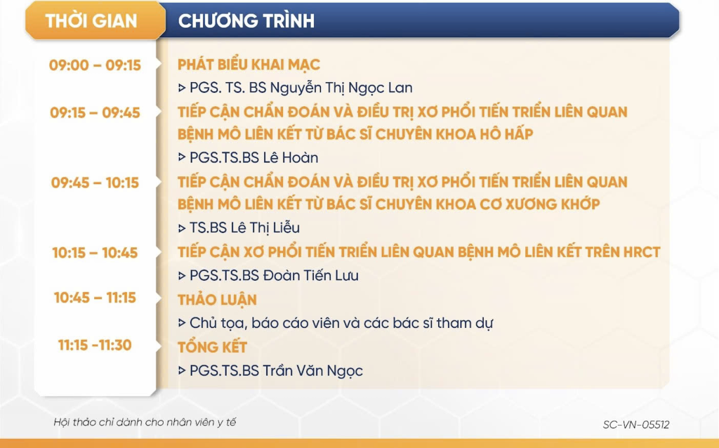 Chương trình có sự tham gia của các chuyên gia hàng đầu thuộc ba lĩnh vực: Cơ Xương Khớp, Hô hấp và Chẩn đoán hình ảnh. Điều này tạo điều kiện trao đổi toàn diện, hướng tới việc xây dựng phác đồ tiếp cận, chẩn đoán và điều trị tối ưu nhất cho người bệnh. Hội thảo là diễn đàn y khoa uy tín để cập nhật các kiến thức mới, chia sẻ kinh nghiệm thực hành lâm sàng, đồng thời cùng nhau tháo gỡ những khó khăn, vướng mắc trong quá trình điều trị.